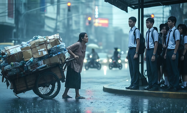 Ang mga magulang na nakasuot ng mamahaling damit ay kusang humawi, yumuko, at nagbigay ng daan para sa isang mangangalakal ng basura.